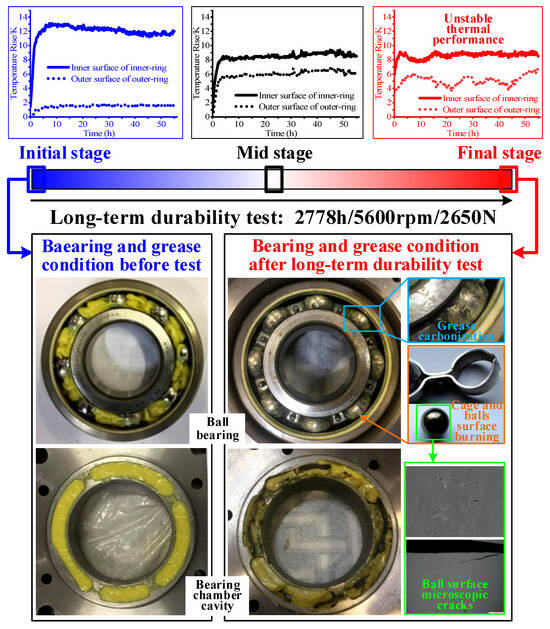 As illustrated in Figure 1, the deep groove ball bearings for the traction motors of high-speed trains were subjected to a multi-stage discontinuous long-term durability test spanning 2778 h. During each stage, the bearing speed was ramped from 0 to 5600 rpm while maintaining a constant radial load of 2650 N, simulating actual operating conditions of traction motors. Post-experimental analysis revealed grease carbonization phenomena in both internal bearing components and chamber surface, induced by sustained frictional heating during testing. The surface morphology characterization of bearing assemblies demonstrated burning marks on the cage and ball surfaces, accompanied by a microscopic crack in the ball surface structure. These observations confirm the critical temperature-dependent degradation mechanisms affecting both bearing surface integrity (particularly smoothness) and lubricant performance. The identified microscopic crack in the final stage implies potential mechanical risks, including abnormal vibration spectra, should the bearing continue operating under such thermally compromised conditions. Conversely, a comparative analysis of temperature rise characteristics on the inner surface of the inner ring and outer surface of the outer ring during the initial, mid, and final stages reveals that the degradation of metal surface smoothness and lubricant effectiveness dynamically alters the frictional heat generation and bearing cooling efficiency. This thermal phenomenon manifests as significant fluctuations in the temperature curves of both surfaces during the final stage, deviating from their theoretically stable thermal progression. The initial stage exhibited higher temperatures compared to the mid-stage, attributable to incomplete grease homogenization. This demonstrates that transient comparisons of bearing temperature rise across different operational stages can effectively reflect both the grease lubrication status and the surface topographical characteristics of bearing components. Consequently, in order to avoid various problems caused by mechanical thermal failures, implementing real-time thermal monitoring and conducting predictive studies on bearing thermal behaviors are essential during long-term durability operation.
