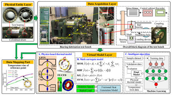 The DT system for bearing thermal analysis comprises four components: the Physical Entity Layer (PEL), the Data Acquisition Layer (DAL), the VML, and the Data Mapping Part (DMP), as illustrated in Figure 2.