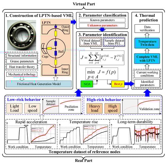 Leveraging high-reliability and high-precision DT technology, this study proposes a virtual–real hybrid framework for bearing thermal prediction under complex operating conditions and long-term operation. The framework employs an NOA-based identification method to determine key thermal parameters in the LPTN model within the VML, addressing the time-varying and ambiguous characteristics of unknown parameters. This enables thermal prediction transitions from low-risk behaviors (low-speed, light-load) to high-risk behaviors (high-speed, heavy-load) in bearing systems. A comprehensive analysis of comparative results yields the following conclusions: