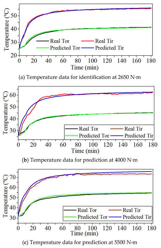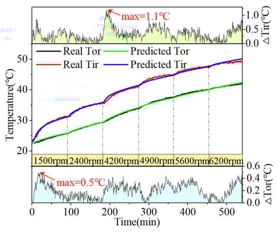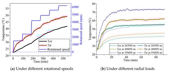 The selection of the datasets is critical for implementing the proposed temperature prediction framework. Furthermore, determining input parameters for the bearing thermal model necessitates physical analysis of temperature-influencing factors. Leveraging the DT system for bearing temperature monitoring, we conducted multi-condition transient thermal tests using bearing lubrication test bench within the PEL and DAL. The resultant temperature variations at reference nodes—outer surface temperature (Tor)of the outer ring and inner surface temperature (Tir) of the inner ring—versus operational inputs (rotational speeds and radial loads) are presented in Figure 4.