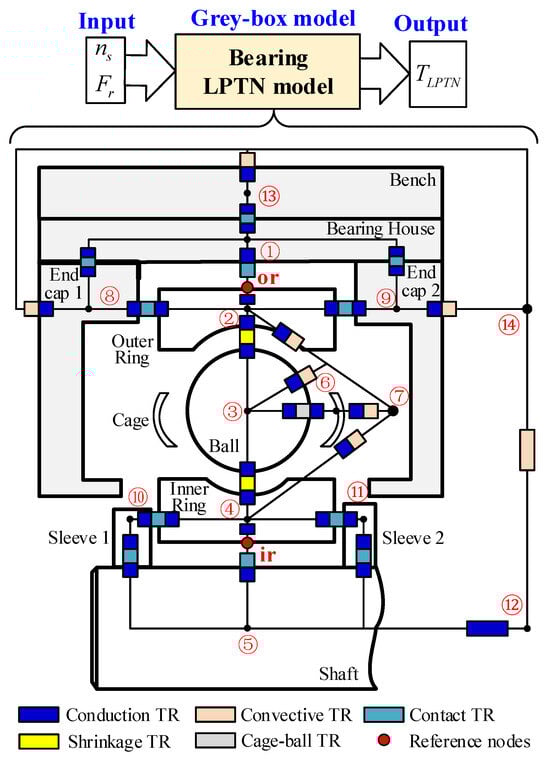 describes the total heat generation of the bearing components. When solving the LPTN model, the total heat generation is distributed to the outer ring, rolling elements, and inner ring in a ratio of 1:2:1 [], namely nodes ②, ③, and ④ in Figure 5.