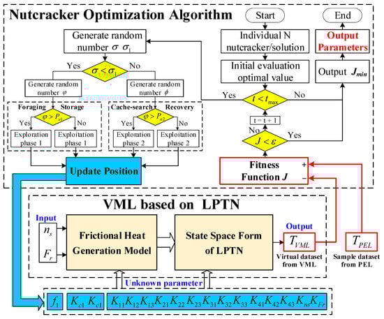 Treating all parameters that need to be identified as independent variables, a fitness function is formulated by aggregating cumulative errors between virtual datasets from the VML and sample datasets from the PEL. This transforms the identification task into a minimization problem seeking optimal parameter values that maximize virtual and sample datasets’ congruence. To accelerate convergence, the Nutcracker Optimizer Algorithm (NOA) is implemented for fitness function optimization.