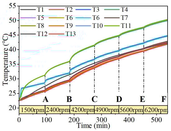 In Figure 4a, the radial load on the bearing is set at 2650 N·m. When the rotational speed is held constant for specific durations, the temperature at the reference node exhibits a continuous rise over time under each constant speed. Furthermore, each switch to a higher speed resulted in a further temperature increase. The bearing consistently failed to reach thermally stable state under unchanged heat dissipation conditions, indicating intensified frictional losses. This demonstrates that rotational speed is one of the factors influencing bearing temperature.
