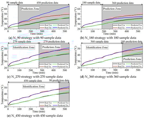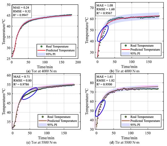 Based on Figure 17a, it can be observed that under a radial load of 4000 N·m, the transient predicted temperature on the outer surface of the outer ring shows a high goodness-of-fit with the real temperature (R2 = 0.9947), with real temperature data points largely falling within the 95% prediction intervals. However, in the other three subfigures, the goodness-of-fit decreases to 0.9567, 0.9786, and 0.95, respectively, indicating reduced prediction accuracy under these conditions. Real temperature points also intermittently fall outside the 95% prediction intervals (marked by blue circulars). These results suggest that the proposed prediction framework requires further enhancement in accuracy under variable load conditions. Additionally, the real temperature data exhibits minor fluctuations under high-load conditions, which may be related to sensor performance. The reliability of sample data remains a critical factor for ensuring accurate parameter identification and early-warning results.