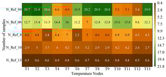 - Under variable-speed conditions, the proposed framework exhibits maximum temperature errors of 1.2 °C and 0.5 °C at reference nodes during identification. With 270 samples, the average Euclidean distance between twin and validation temperatures reaches a minimum of 4.9 K. Expanding the number of reference nodes from 4 to 13 reduces the average Euclidean distance from 13.7 K to 0.4 K, validating its capability for thermal prediction from low-speed to high-speed and highlighting the benefits of multi-speed-range samples. The uncertainty analysis of the rapid acceleration test shows that all real temperature data points fall within the 95% prediction intervals of the predicted temperatures, confirming the robust predictive capability of the implemented framework.