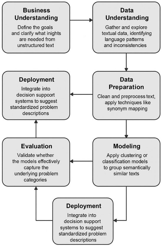 In the context of automating the management of data import errors for technical equipment systems, the CRISP-DM (Cross Industry Standard Process for Data Mining) methodology offers a structured and iterative approach to applying artificial intelligence to a real-world operational challenge. We adapt CRISP-DM for text mining to help standardize the understanding and representation of problems described in natural language by different individuals, see Figure 2. The process involves: