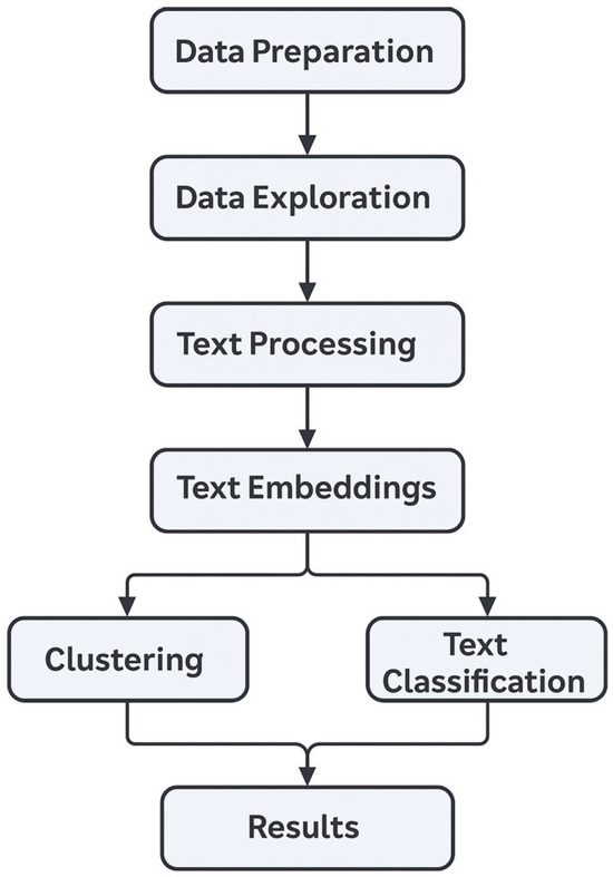 The diagram of Figure 4 illustrates the main stages of the complaint analysis pipeline. After initial data preparation and exploration, the process involves text cleaning and processing, followed by the generation of text embeddings. These embeddings are then used in two parallel tasks: semantic clustering of complaints and supervised text classification, leading to the production of actionable results.