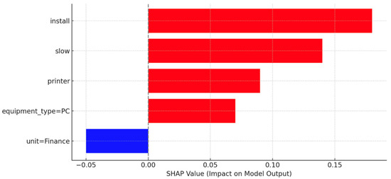 To enhance model interpretability, SHAP (SHapley Additive exPlanations) values were computed for representative classification outputs. The SHAP analysis quantifies the impact of each input feature—whether structured or textual—on the final prediction made by the Random Forest classifier. Figure 7 illustrates the most influential features, highlighting the words “install”, “slow” and “printer” as the top positive contributors to the model’s prediction, while the “unit=Finance” feature had a negative impact.