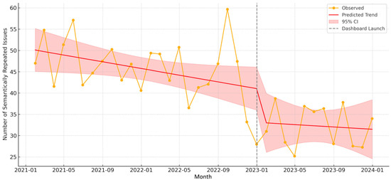 To further substantiate the impact of the dashboard deployment, we conducted an interrupted time-series (ITS) analysis to evaluate whether the observed reduction in repeated complaints could be causally linked to the intervention. Weekly counts of semantically repeated issues were aggregated over a three-year period, with the dashboard rollout in early 2023 serving as the intervention point. As shown in Figure 9, the ITS model identified a statistically significant level shift following deployment, along with a continued decline in the post-intervention slope. The red trend line represents the segmented regression fit, with shaded 95% confidence intervals. The immediate post-deployment drop, combined with the sustained downward trajectory, supports the hypothesis that the dashboard contributed to the reduction in redundant complaints, rather than the effect being merely a product of natural fluctuation or seasonal cycles.