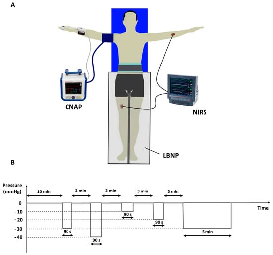 Experimental setup including CNAP and NIRS devices along with the LBNP chamber (A). Experimental protocol (B): the sequence of the 90 s lasting stimuli was randomized, while the 5 min lasting stimulus always followed at the end.