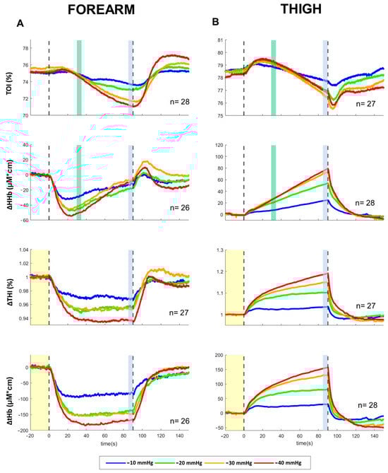 Averaged response of NIRS parameters recorded from the forearm (A) and the thigh (B) during 90 s exposure to LBNP of −10, −20, −30, −40 mmHg. Vertical dashed lines indicate the start and the end of the LBNP stimulus; vertical colored bands indicate where the measurements were taken to quantify average effects and slopes (Figure 3), the yellow band indicating the baseline. TOI: tissue oxygenation index; HHb: deoxy-hemoglobin concentration; THI: tissue hemoglobin index; tHb: total hemoglobin concentration. The THI tracings were normalized to baseline; HHb and tHb baselines were set to 0. The number of subjects (n) includes males and females pooled together.