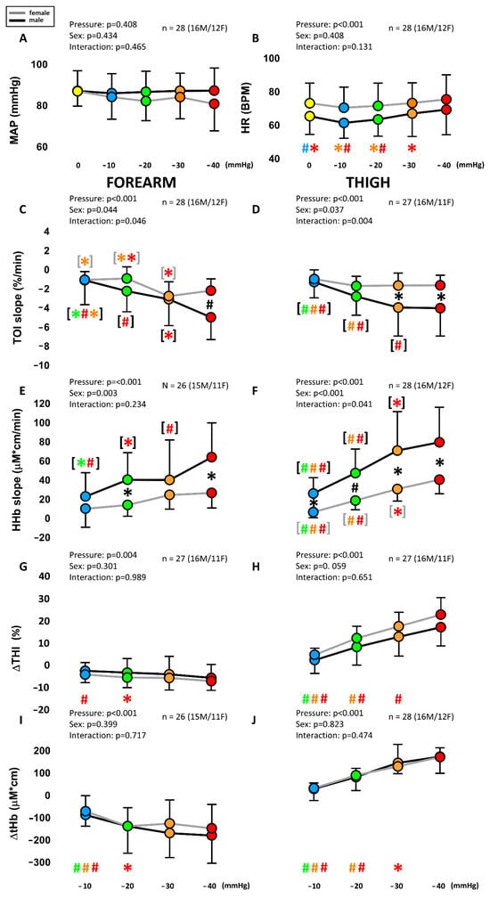 Average of LBNP on systemic variables (A,B) and local NIRS variables from the forearm (C,E,G,I) and the thigh (D,F,H,J) in males and females. MAP: mean arterial pressure; HR: heart rate; TOI: tissue oxygenation index; HHb: deoxy-hemoglobin concentration; THI: tissue hemoglobin index; tHb: total hemoglobin concentration. Different colors are associated with the different pressure levels, while the black and gray lines indicate males and females, respectively. Main effects and interaction are reported in text form and post hoc tests are reported with symbols (#: p < 0.001; * p > 0.05), the color identifying the pressure level considered in the comparison, e.g., a red asterisk over the green dot indicates a significant difference between the red (40 mmHg) and green (20 mmHg) conditions. If # and * are within black (gray) square brackets they refer specifically to the male (female) group. Otherwise, they refer to the whole group (males + females). The total number of subjects (n) is also distinctly specified for males (M) and females (F).