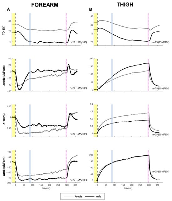 In resting conditions, males were also characterized by lower HR (65.3 ± 10.8 vs. 73 ± 12.0 BPM, p = 0.085) and TOI in the thigh (76.4 ± 7.5 vs. 81.1 ± 7.1%, p = 0.015), while no difference was detected in MAP (87.1 ± 7.4 vs. 86.9 ± 10.1 mmHg, p = 0.945) and in TOI in the forearm (72.5 ± 7.3 vs. 76.7 ± 5.0%, p = 0.107).