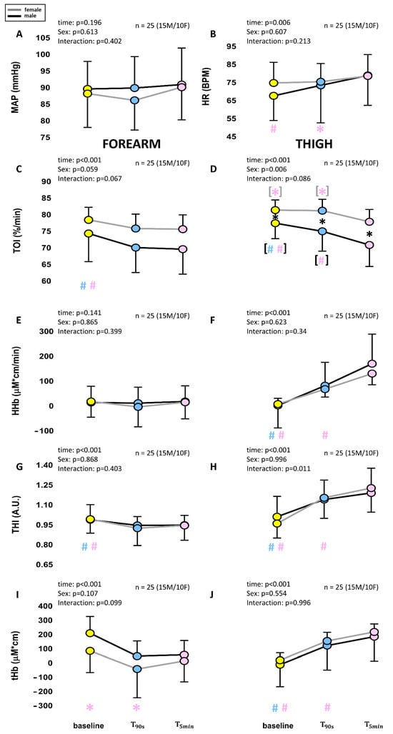 Comparison of average changes at 90 s (T90s) and 5 min (T5min) from the beginning of a −30 mmHg LBNP stimulus. The diagrams show changes in systemic (A,B) and NIRS variables col-lected from the forearm (C,E,G,I) and the thigh (D,F,H,J) as shown in Figure 4. Different colors are associated with the different times, while the black and gray lines indicate males and females, re-spectively. Main effects and interaction are reported in text form and post hoc tests are reported with symbols (#: p < 0.001; * p > 0.05), the color identifying the pressure level considered in the comparison, e.g., a red asterisk over the green dot indicates a significant difference between the red (40 mmHg) and green (20 mmHg) conditions. If # and * are within black (gray) square brackets they refer specifically to the male (female) group. Otherwise, they refer to the whole group (males + females). The total number of subjects (n) is also distinctly specified for males (M) and females (F).