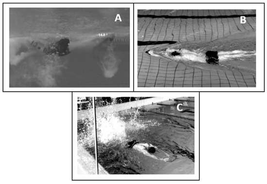In the first test (Figure 1, panel A), the swimmers performed a 25 m maximal-effort front crawl starting with a push-off against the wall after an audible signal, maintaining their normal breathing pattern. Each swimmer performed this test alone, without any other disturbances in the nearest lanes. The 25 m time (T25, in s) was manually assessed by a certified coach using a stopwatch (FINIS 3 × 100, Finis Inc.) and considered the time taken (in s) to cover 25 m and the mean velocity (v, in m/s) was estimated thereafter. The stroke rate (SR, in Hz) was assessed using a frequency chronometer (FINIS 3 × 300, Finis Inc.) activated over three consecutive stroke cycles. The stroke length (SL, in m) was then estimated (SL = v/SR), along with the stroke index (SI, in m2/s) (SI = v·SL), as previously described [15]. This test was recorded on video (at a frequency of 120 Hz) in the sagittal plane (right side) with a camera (Go Pro 6, resolution 1920 × 1080 pixels, San Mateo, CA, USA) mounted on a rigid iron fixed at 0.26 m, providing a view below the water’s surface. The system was positioned at around 15 m from the starting wall, on the side of the pool, perpendicular to the line of movement and 5 m away from the swimmer, providing a range of views between the 11th and 24th m. The images were stored on a USB memory stick, enabling data to be collected and processed using a computer and a video annotation tool (Kinovea®, v. 0.8.15).