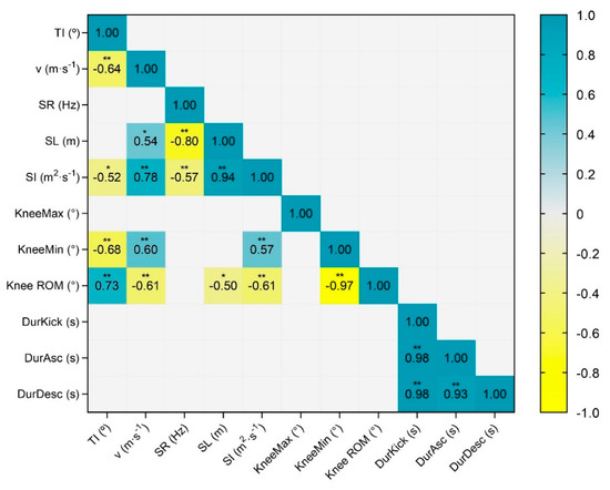Figure 2 shows the correlation matrix between the TI and the kinematic variables. A negative association was found between the TI and v (r = −0.64, p = 0.002), SI, (r = −0.52, p = 0.03), KneeMin (r = −0.68, p = 0.002), and KneeROM (r = −0.73, p = 0.001). The remaining kinematic variables showed no association with TI.