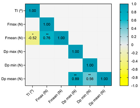 Figure 3 shows the correlation matrix between the TI and the kinetic variables. A negative association was only found between the TI and Fmean (r = −0.52, p = 0.02). The remaining kinetic variables showed no association with the TI.