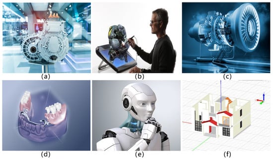 Real-world applications of CAD-related technologies: (a) automotive manufacturing; (b) education; (c) aerospace engineering; (d) the medical field; (e) robotics; (f) architectural design.
