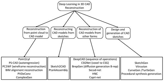 The reconstruction of 3D CAD has always been a challenge in the field of deep learning. In the past two decades, with the continuous development of technology, the realization of 3D CAD reconstruction in this field has become increasingly feasible [29]. The research community has been committed to reconstructing 3D CAD models from point clouds, sketches, and other forms, and there have also been related studies on the generation of 2D CAD sketches [30,31,32].