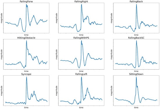 Figure 1 shows sample smartphones’ accelerometer data for eight different types of falls and, additionally, a sitting-down activity. It can be noticed that there is only a slight difference between those activities, which is not obvious at first glance. The subtle variations in accelerometer readings caused by different user activities present a formidable obstacle to achieving robust and precise classification.
