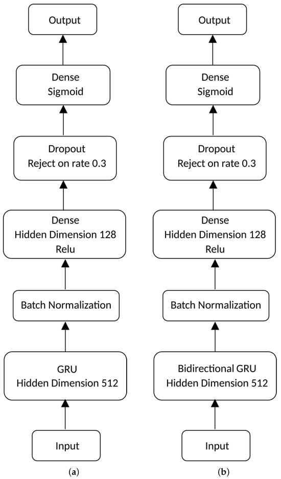 Initially, we performed tests to measure the training time for an alternate approach with the LSTM layer in our models. We measured training and inference times for RNN- and BRNN-based models using GRU and LSTM layers to compare the computational efficiency of different recurrent architectures. The RNN model with a GRU layer required approximately 24 s per training epoch, while the bidirectional GRU variant (BRNN) increased this to 47 s. When replacing GRU with LSTM, training times increased notably, 33 s for a standard RNN and 63 s for the BRNN. These results confirm that GRU-based models are significantly more efficient during training, which is particularly beneficial for scenarios involving limited computational resources or frequent retraining.