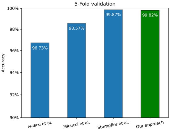 3] achieved the highest results using the 5-Fold Cross-Validation method, achieving a 98.57% accuracy score. Another approach using this validation method was proposed by Ivascu et al. [