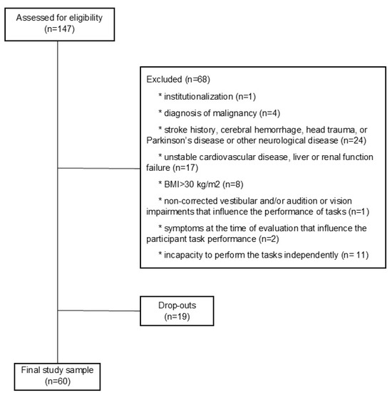 The sample size calculation was conducted through the “G*Power 3.1.9.7” statistical software. By having an estimation of the statistical power, significance level, and expected effect size through the difference between two independent-mean T tests, it was possible to establish an “a priori sample size calculation” that determined the minimum value required to minimize the publication bias of the current study [36]. Using the purpose of detecting differences on the “hip angle at TO” of older adults during the stair descent trial of Marques et al., it was possible to estimate an “effect size of d” of 0.8631101 for an “α err prob” of 0.05 and a “power” of 0.8 [34]. The result of the sample size calculation was 23 participants in each group, with a total sample size of 46. In studies examining falls among older adults, it is possible not to have groups with the same N, as long as around 30% of the participants present HoF, since it has been consistently estimated in the previous literature that the prevalence of falls in this population stands at 30% [17,34,37].
