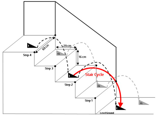 Schematic demonstrating the ipsi limb (I—in black) and contralateral limb (CL—in gray) trajectories during the stair descent. The red arrow represents the stair cycle, starting with the ipsi limb on step 2 and terminating with the ipsi limb on level ground. The triangle on the step represents the stance phase, and the dashed line represents the swing phase. Stair descent data selected for further analysis were extracted from the stair-cycle and the gait-transition data from the gait cycle on level ground.
