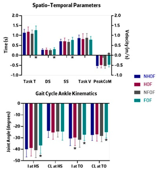 The task’s spatiotemporal descriptive statistics are summarized in Table 2 and plotted in Figure 3. Older adults with FoF exhibited significantly longer task (p = 0.009), double-support (p = 0.047), and single-support (p = 0.009) times when compared to older adults without FoF. On the contrary, the FOF group showed a significantly reduced peak downward CoM velocity than the NFOF group (p = 0.043). There was no interaction between HoF and FoF for any dependent variable.
