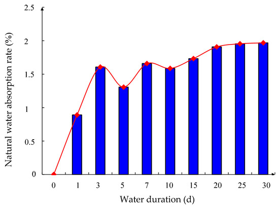 - The natural water absorption rate of coal rock reaches its peak after being immersed in water for 1 day. As the immersion duration increases, the absorption rate gradually stabilizes at around 20 days, indicating the gradual saturation of the coal rock with water absorption. The saturated natural water absorption rate is 1.97%. The longitudinal wave velocity of the coal rock tends to increase after water immersion.