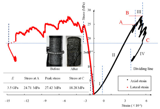 - Short-term water immersion results in an improvement in the plasticity of the coal rock with only a minor softening effect, resulting in a relatively complete damage morphology and a low degree of fragmentation. Conversely, prolonged water immersion results in the significant softening of the coal rock, which causes a shift in the damage morphology from shear fracture to longitudinal fracture. A negative exponential function was used to establish the relationship between the compressive strength and peak strain of the coal rock during continuous immersion, revealing a linear correlation between the elastic modulus and immersion duration.