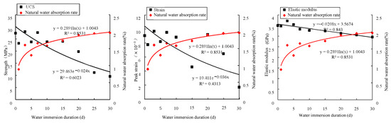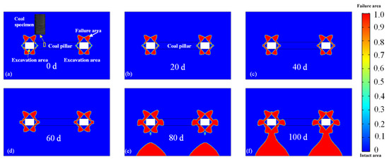 - The fitting curves of the compressive strength and elastic modulus under different immersion durations were obtained. The mechanical reduction relationship was applied to the failure patterns of coal pillars in underground reservoirs. The damage area of the coal pillar and the surrounding rock of the excavation area is expanded when increasing the duration of water immersion.