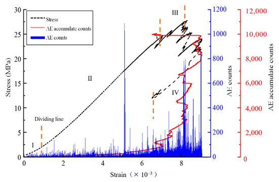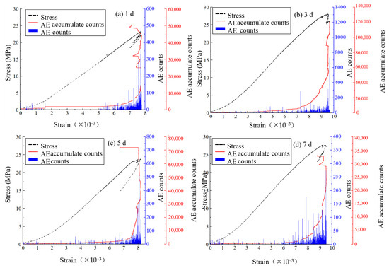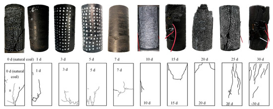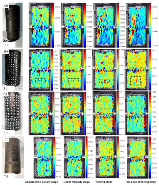 - The active periods of acoustic emission in coal rocks with different water immersion durations are comparable, with the most significant stress peaks occurring near the highest intensity. With increasing immersion durations, the cumulative number of acoustic events decreases, indicating the pronounced attenuation effect of water. Furthermore, the longer the immersion duration, the lower the extent of damage and the higher the level of integrity. The number of failure areas in the compressive fracture process of coal rock decreases after water immersion. The area of strain concentration forms a narrow strip in the direction of vertical lamination, and this is significantly influenced by the orientation of the primary joints within the coal.