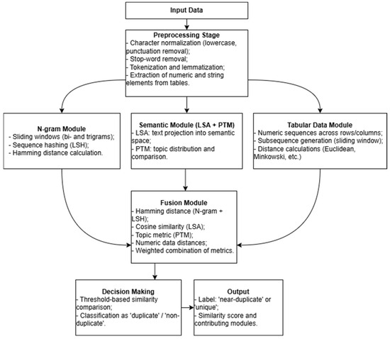 Hybrid approaches combining syntactic and semantic analysis have improved detection accuracy. Locality-sensitive hashing and N-gram analysis are effective for identifying similarities in modified text fragments [10,11,12,13]. In particular, the methods for identifying near duplicates in scientific papers, which include the content of the same type, such as text data, mathematical formulas, and numerical data, are described in the article [14]. For text data, the method of locally sensitive hashing, which involves the finding of Hamming distance between the elements of indices of scientific papers was formalized. For numerical data, subsequences for each scientific work are formed, and the proximity between the papers is determined as the Euclidian distance between the vectors consisting of the numbers of these subsequences. To compare mathematical formulas, the method of comparing sample formulas is used and the names of variables are compared. Two directions are separated: finding key points in the image and applying locally sensitive hashing for individual pixels of the image to identify near duplicates in graphic information. Lizunov et al. [12] describe the application of detecting near duplicates in tables using the locality-sensitive hashing method and the nearest neighbor method. However, it should be noted that these studies largely depend on the collected database and do not consider the peculiarities of agglutinative languages, particularly the Kazakh language.