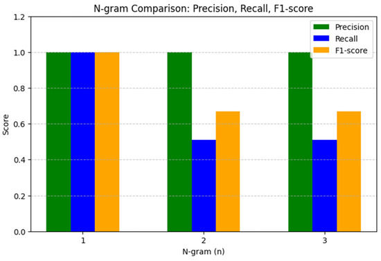 The results of the N-gram analysis depended significantly on the chosen value of n. Unigrams achieved perfect accuracy (1.00) and completeness (1.00), but the lack of context consideration limited the detection of paraphrased or partially modified texts. When moving to bigrams and trigrams, there is a decrease in completeness to 0.51 while maintaining accuracy at 1.00, resulting in an F1-measure of 0.67. At the same time processing time increases from 14.81 s (bigrams) to 16.79 s (trigrams) (see Table 4 and Figure 2).