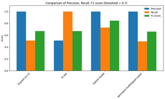 To justify the relevance and competitiveness of the hybrid approach, we conducted a direct comparison with the baseline BERT-like model bert-base-multilingual-cased [35]. The proposed hybrid method demonstrates comparable accuracy while requiring significantly fewer computational resources and avoiding the need for large pre-trained transformer models. This confirms that the combination of lightweight models remains a practical and efficient solution for near-duplicate detection tasks in low-resource agglutinative languages.