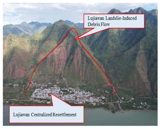 The study area is located at the Lujiawan resettlement site in Dayao County, Yunnan Province, within a tectonically incised mid-mountain belt along the Jinsha River. The terrain exhibits a southeast-to-northwest decline in relief, with a highly dissected landscape. Ridge lines predominantly trend north–south, aligning with regional master faults. The landform is characterized by deeply incised mid-mountain terrain, with a maximum relative relief of 901.92 m, resulting in the development of pronounced steep slopes. Data acquisition was based on the China Geodetic Coordinate System 2000 (CGCS2000) for planar coordinates, the 1985 National Elevation Datum, and the 3° Gauss–Krüger projection with a central meridian of 102° E. Terrain mapping was carried out using a DJI Matrice 350 RTK UAV equipped with a Zenmuse L2 airborne LiDAR sensor. The LiDAR sensor is equipped with multi-frequency scanning and dual-polarized antennas, achieving a ranging accuracy of 2 cm at a distance of 150 m and a maximum range of 500 m. Each laser pulse can record up to five returns, with a scanning field of view of ±30° in the vertical direction and ±45° in the horizontal direction, enabling vegetation penetration to accurately capture the ground surface. Flight paths were designed in a grid pattern, with a consistent flight altitude of 70 m above ground level. The flight lines were further refined to account for substantial elevation changes and steep terrain, ensuring full coverage of critical and potentially occluded areas. Figure 1 presents a panoramic view of the Lujiawan resettlement site.