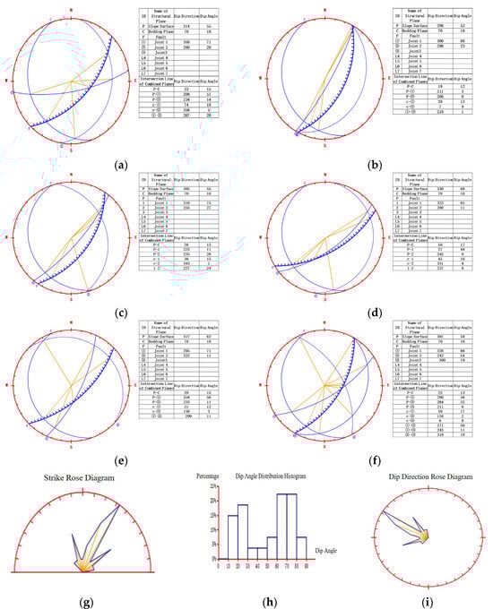 Stereographic Projection Diagrams and Joint-Fracture Rose Diagrams: (a) WY1 Stereographic Projection Diagram; (b) WY2 Stereographic Projection Diagram; (c) WY3 Stereographic Projection Diagram; (d) WY4 Stereographic Projection Diagram; (e) WY5 Stereographic Projection Diagram; (f) WY6 Stereographic Projection Diagram; (g) Overall Joint-Fracture Strike Rose Diagram; (h) Dip Angle Distribution Histogram; (i) Overall Joint-Fracture Dip Direction Rose Diagram.