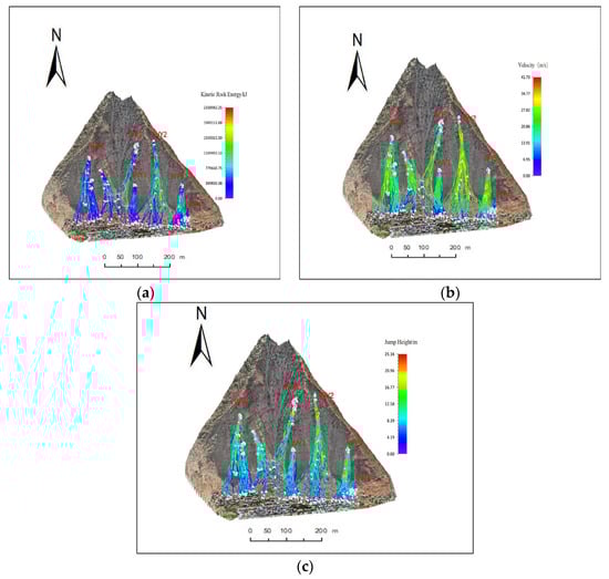 The Lujiawan resettlement area is characterized by steep terrain, where prolonged human activity and rock mass weathering have destabilized multiple hazardous rock masses, leading to varying levels of economic loss for residents along the slope. To quantitatively and visually assess the rockfall threat to the downslope area of the resettlement site, this study performed detailed trajectory analyses for WY3 and WY6—two rock masses with the steepest slope angles and largest volumes. As illustrated in Figure 9, the energy–velocity–rebound height profiles reflect the dynamic evolution of energy accumulation and dissipation during the rockfall process. Comparative analysis further indicates that WY2 exhibits a similar acceleration trend to WY3 and WY6 during descent but with even higher rebound heights—indicating comparable or greater overflight and impact potential. Therefore, WY2 should be prioritized alongside WY3 and WY6 in hazard classification and mitigation planning. These findings not only refine the quantitative understanding of WY3 and WY6, but also provide strong numerical evidence supporting the classification of WY2 as a high-risk source—highlighting the urgent need for timely mitigation interventions.