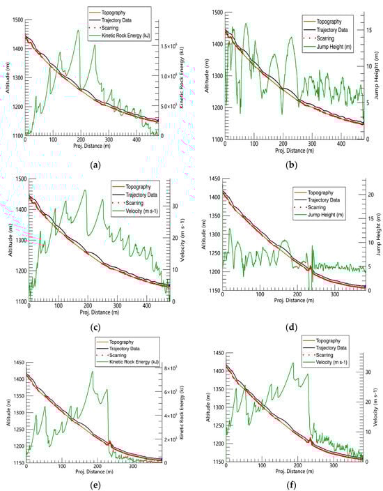 Rockfall Movement Curves: (a) WY3 Rockfall Kinetic Energy-Position; (b) WY3 Curve Rockfall Bounce Height-Position; (c) WY3 Curve Rockfall Velocity vs. Position Curve; (d) WY6 Rockfall Kinetic Energy-Position (e) WY6 Curve Rockfall Bounce Height-Position; (f) Curve Rockfall Velocity vs. Position Curve.