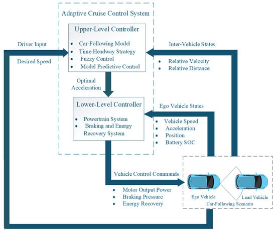 Figure 1 presents the hierarchical control structure employed in this study. The upper-level controller computes the optimal acceleration using a fuzzy-enhanced MPC algorithm, while the lower-level controller executes the command via the powertrain and braking subsystems.