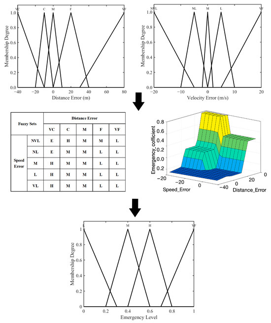 A fuzzy inference mechanism to evaluate an emergency coefficient from distance and velocity errors;