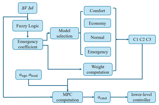 This architecture separates high-level decision-making from low-level actuation, and the figure illustrates key signal flows between modules such as vehicle state estimation, fuzzy inference, and MPC optimization. The overall control structure is adapted from the two-layer predictive cruise control framework proposed in [