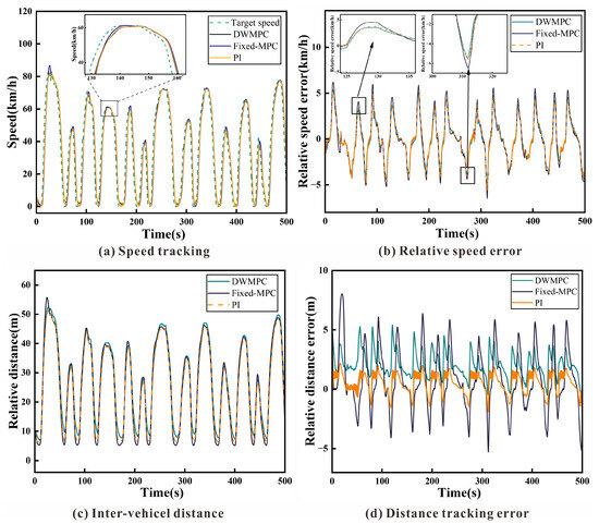 Figure 5c,d shows that DWMPC maintains a stable inter-vehicle distance with low fluctuation. Other controllers tend to over- or under-compensate, especially under high-frequency variations. The corresponding distance error plot (