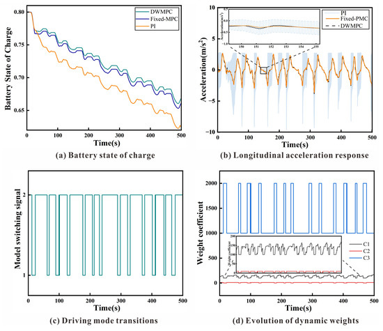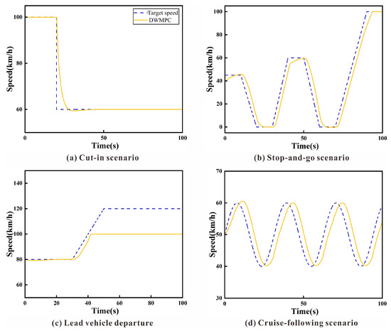 Figure 9c), DWMPC smoothly increases speed and stabilizes at the predefined cruise speed of 100 km/h, indicating effective recognition of reduced urgency and efficient mode switching. In the cruise-following scenario (