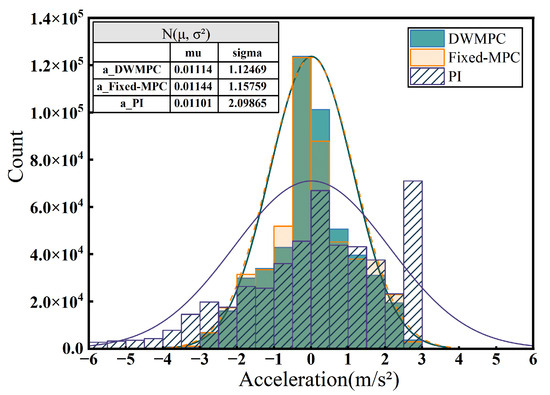 Figure 7 further supports these findings. Compared with the broader, asymmetric distributions of PI and fixed-MPC, the acceleration histogram of DWMPC is compact and symmetric around zero. Most values fall within