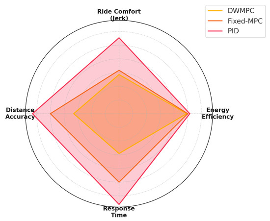 In summary, DWMPC excels not only in static performance but also through a self-regulating, risk-aware control architecture. By continuously sensing traffic context and adjusting control priorities in real time, it maintains a robust balance among energy economy, ride comfort, and safety responsiveness, surpassing the limitations of fixed-weight strategies.