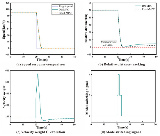 Simulations confirm that DWMPC significantly reduces velocity tracking errors and mitigates abrupt acceleration changes during critical events such as emergency braking and stop-and-go traffic. Its dynamic weighting mechanism enables real-time prioritization among competing objectives, striking a flexible balance between safety and energy efficiency, which is an essential requirement for intelligent electric vehicle deployment.