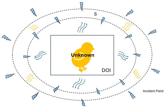 Given the known spatial distribution of the dielectric permittivity tensor, the total electric field E is computed using Equations (3), (7), and (8), while the scattered field is subsequently obtained from Equations (4), (9), and (10). To enable numerical simulation of the forward scattering problem, the object domain is discretized into small regions, within which the material properties and field values are assumed to remain constant. Similarly, the boundary surface S is subdivided into equally sized elements to maintain spatial uniformity of both the electric field and the permittivity in each portion. For the n-th region, the dielectric coefficients along the x-, y-, and z-axes are represented by , , and , respectively.