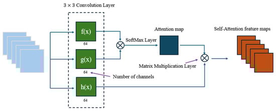 This section provides a detailed explanation of the GAN architecture shown in Figure 2. We begin by generating an initial estimate of the image, denoted as . This estimated image is then fed into the generator to produce the output image . Subsequently, the discriminator evaluates the difference between the real image and the generated image , which is used to compute the loss function. Here, represents the unknown parameters in the generative network. Moreover, represents the discriminator network, where denotes the unknown parameter of the discriminator. The output of this network is a discriminative matrix. The generative network and the discriminator are trained alternately in a competitive manner, with each network updating in response to the other. A GAN is composed of an SRNN generator with an SA mechanism and a discriminator. First, the overall architecture of the SRNN with the SA mechanism, as shown in Figure 3, takes the image input and passes it through the encoder. The encoded image and the image processed by the SRNN are then combined and fed into the discriminator. Next, the structure of the SRNN generator with SA in Figure 4 is introduced. The SRNN generator adopts CNN architecture, which consists of a contracting network on the left and an expanding network on the right. The contracting network incorporates repeated convolution layers, BN layers, and ReLU layers. Additionally, a max pooling layer is introduced in the pooling layer of the contracting network. In the expanding network, up-convolution layers, BN layers, and ReLU layers are added, followed by a convolution layer serving as the fully connected layer. SA is incorporated at the output of SRNN to enhance the quality of the reconstructed image. Next, the SA mechanism shown in Figure 5 is described in detail. It consists of three convolution layers, where two of them pass through a Matrix Multiplication Layer (MML) and a SoftMax layer. The MML is served as a fully connected layer. The results generated by the generator are fed into the discriminator for evaluation. Finally, the architecture of the GAN discriminator in Figure 6 is presented. It consists of one convolution layer, three additional convolution layers, BN layers, and ReLU layers. The discriminator receives as input the image generated by the generative network. In essence, the discriminator assigns a score based on its evaluation. This score determines whether the generative network needs to adjust its training weights. The process continues iteratively until a satisfactory equilibrium is reached. In GANs, the loss function of the generative network, denoted as is defined in (35).